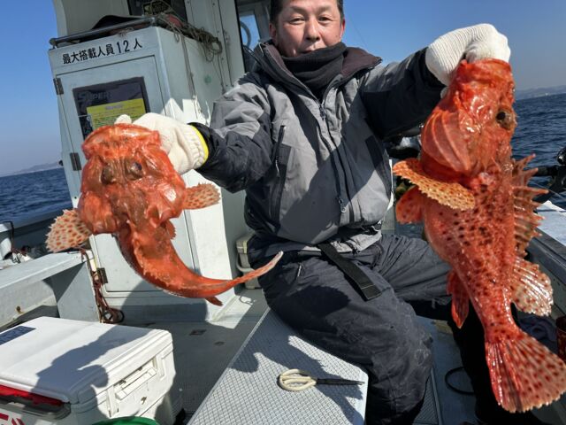 共に7時20分出船。カサゴ船ショート。猿島沖20-35m。良型主体で数釣り期待。ハギ竹岡沖◆仕立受付