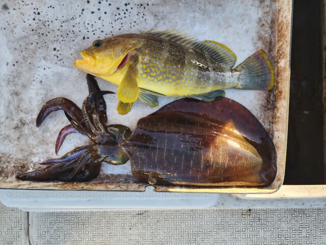 レンタルボートで賀田湾内に出てのエギングで狙える。エギ3~3.5